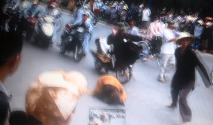 Đang “tháp tùng” đại đức Thích Tâm Mẫn “nhất bộ nhất bái” trên một đoạn phố đông đúc, một tiểu sư thày bất ngờ lao lên “tung chưởng” rồi ném cả chiếc mũ cối vào người đi đường khiến nhiều người hết sức bất bình.