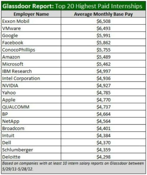 Điều cốt yếu rút ra từ bản báo cáo này đó là việc các thực tập sinh ở vị trí kĩ sư phần mềm tại các hãng công nghệ lớn thường có một mức lương cao. Trên thực tế, một thực tập sinh tại Google có mức lương trung bình 5.991 USD/tháng; trong khi Exxon Mobil dẫn đầu danh sách này với mức lương 6.508 USD. Thực tập sinh tại các hãng công nghệ nổi tiếng khác cũng có mức lương không hề tệ chút nào: Amazon (5.489 USD/tháng), Microsoft (5.462 USD/tháng) và Apple (4.770 USD/tháng). Các hãng công nghệ đứng cuối bản danh sách này là Yahoo, BP, Intuit và Dell. Theo Glassdoor, nhìn chung các thực tập sinh kĩ sư phần mềm có mức lương trung bình vào khoảng 5.666 USD/tháng.