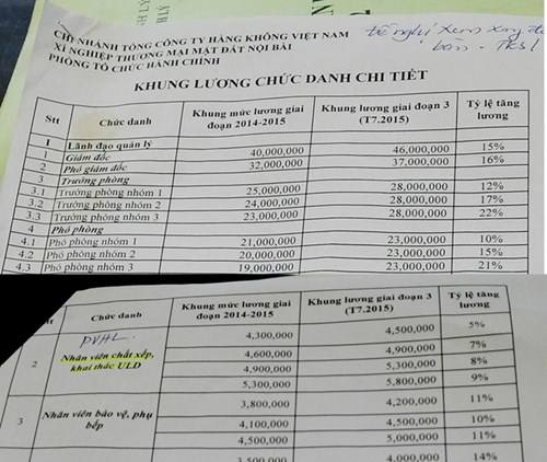 Bảng lương của lãnh đạo Xí nghiệp Niags (trên) và lương của công nhân phục vụ hành lý (dưới) trước và sau khi tăng lương vào tháng 7/2015. Ảnh: L.H.V