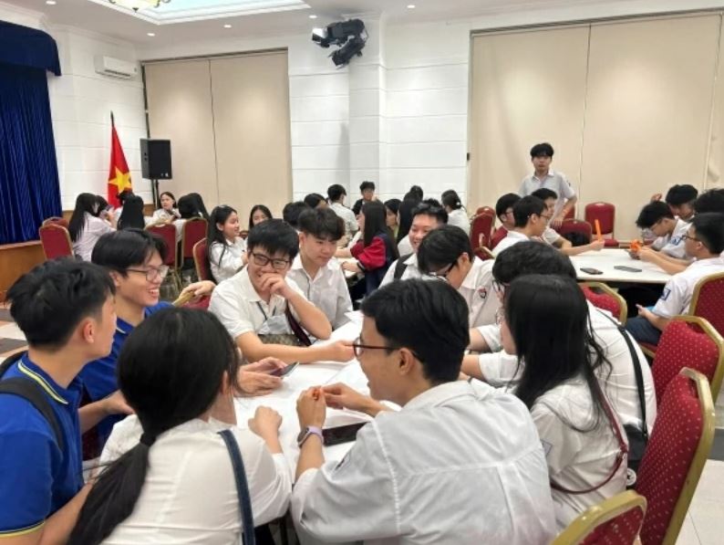 Gia Hân (ngoài cùng bên trái) cho biết, em cảm thấy thích thú khi được học tập, giao lưu với học sinh đến từ nhiều trường THPT khác, đặc biệt là các bạn người Nga đang học tại Việt Nam. (Ảnh: Yến Vi)