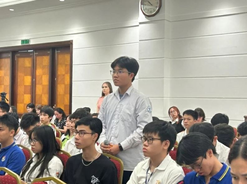 Học sinh đến từ các trường THPT trong phần giao lưu hỏi đáp với Trung tướng Phạm Tuân. (Ảnh: Yến Vi)