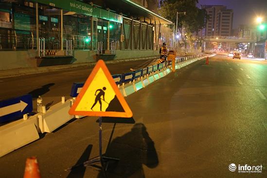 Theo kế hoạch, các đơn vị thi công đã tranh thủ lắp dải phân cách cứng phân làn cho xe buýt nhanh BRT ngay trong đêm.