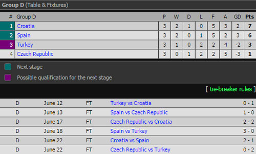 Sau khi bảng D khép lại, Croatia giành vị trí nhất bảng với 7 điểm sau 3 trận, Tây Ban Nha đứng thứ 2 với 6 điểm. Như vậy, cả hai đều thẳng tiến vào vòng 1/8 EURO 2016.