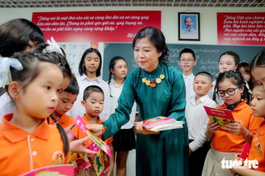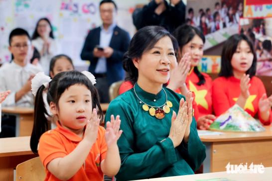 Nhân dịp này, Phu nhân Tổng Bí thư Tô Lâm đã trao tặng quà là những quyển sách, cuốn truyện tiếng Việt đến các em học sinh và ngồi cùng các em nhỏ, vỗ tay theo những điệu múa trên các bài hát về quê hương Việt Nam.