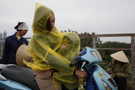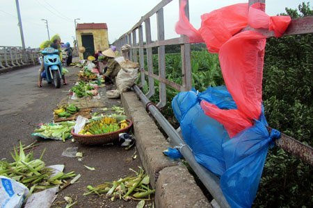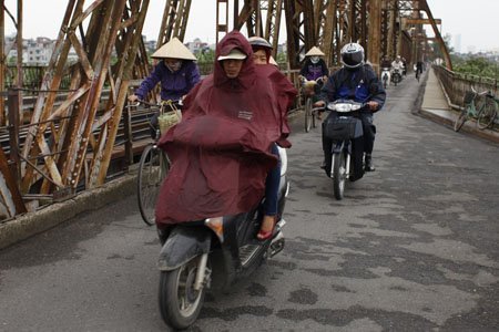 Gió lộng trên cầu Long Biên, những người bán hàng ở đây đều phải mặc thêm áo mưa cho đỡ rét