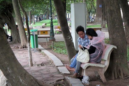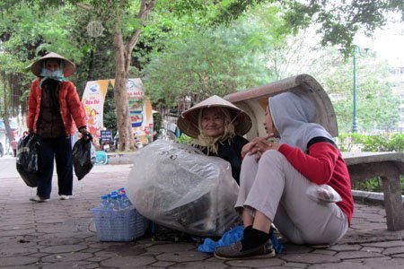 Cụ già bán nước chè ở hồ Hoàn Kiếm núp gió sau chiếc ghế