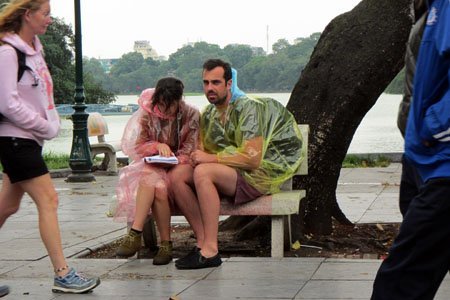 Những vị khách du lịch mặc áo mưa cho đỡ lạnh khi dạo phố Hà Nội