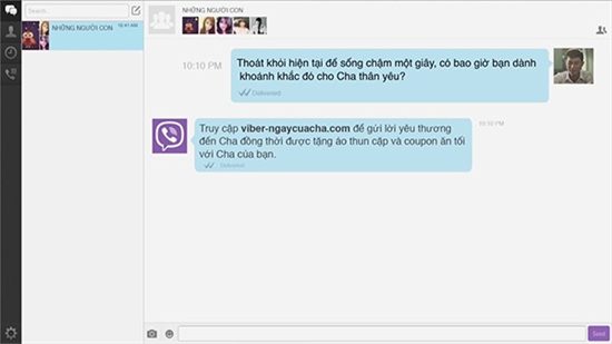 Đặc biệt hơn, sử dụng Viber để nhắn tin tham gia vào chương trình đặc biệt chỉ dành riêng cho Ngày của Cha để nhận ngay voucher ăn tối hấp dẫn chỉ dành riêng cho Cha và Con do Viber tổ chức, những chiếc áo thun cực kỳ độc đáo cùng rất nhiều quà tặng ý nghĩa và hấp dẫn khác để tặng Cha, bạn nhé.