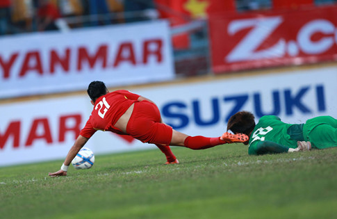 Tuấn Tài có cơ hội đối mặt thủ môn, nhưng anh xử lý quá chậm để thủ môn Đài Loan kịp lao ra phá bóng.