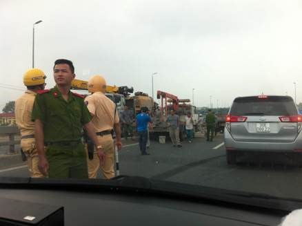 Lực lượng CSGT và CAH Đông Anh vừa khắc phục sự cố giải phóng hiện trường đồng thời phân luồng cho các phương tiện di chuyển an toàn lên sân bay Nội Bài (Ảnh Phạm Nguyệt Trang)