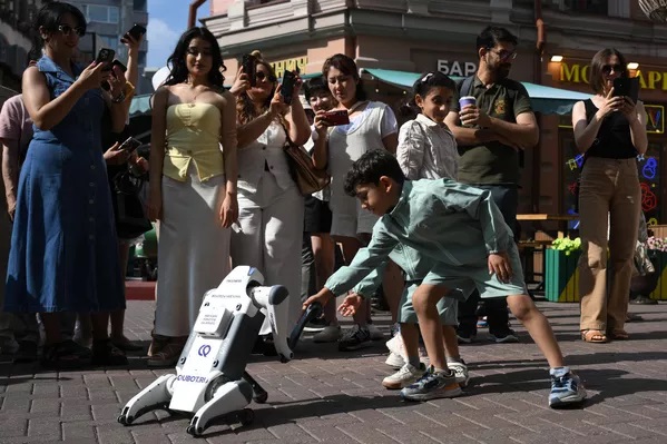 Một cậu bé bắt tay robot chó trên phố Arbat