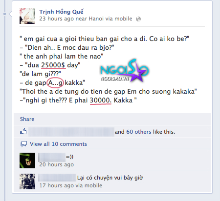 Vừa mới thi xong tốt nghiệp, Hồng Quế đã post lên Facebook một đoạn hội thoại đưa ra bảng giá cho chính mình. Trong lúc thông tin bán dâm của các hoa hậu, người mẫu đang “nóng” thì sự việc này lại khiến cho nhiều người băn khoăn, nghi ngờ.