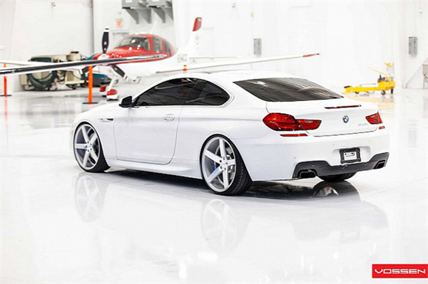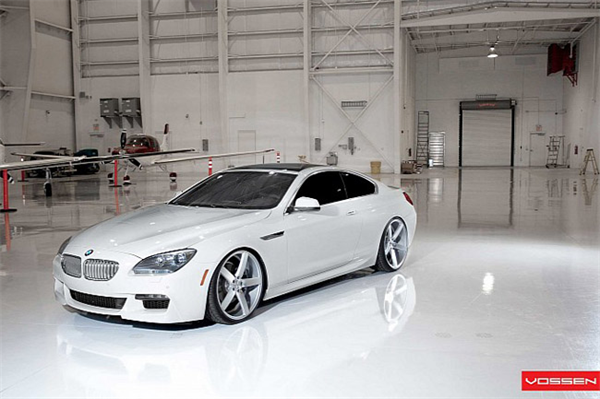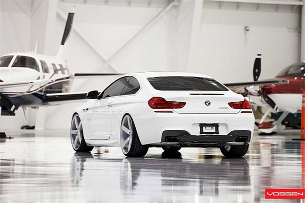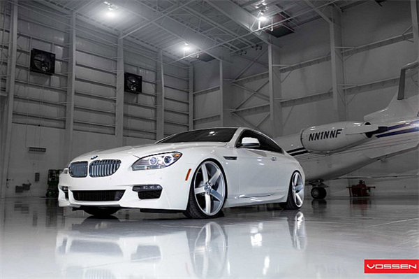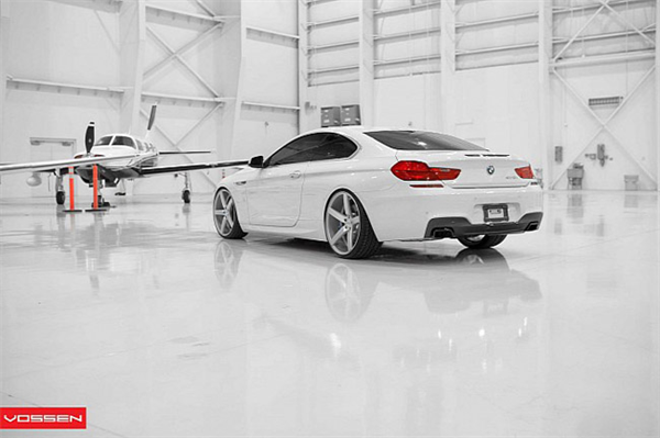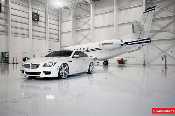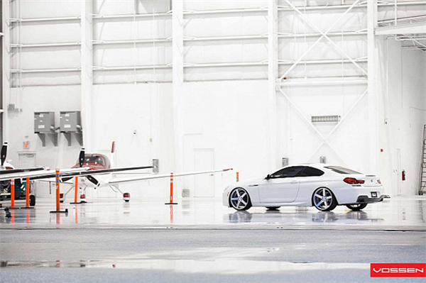 Khoác "bộ cánh" ngoại thất trang nhã thôi chưa đủ, BMW 6-Series trong ảnh còn được trang bị bộ lazăng Vossen 22 inch màu trắng "ton sur ton". Tạo dáng bên chiếc máy bay đồ sộ, BMW 6-Series vẫn thật nổi bật nhờ sự đơn giản và sang trọng không thể phủ nhận.
