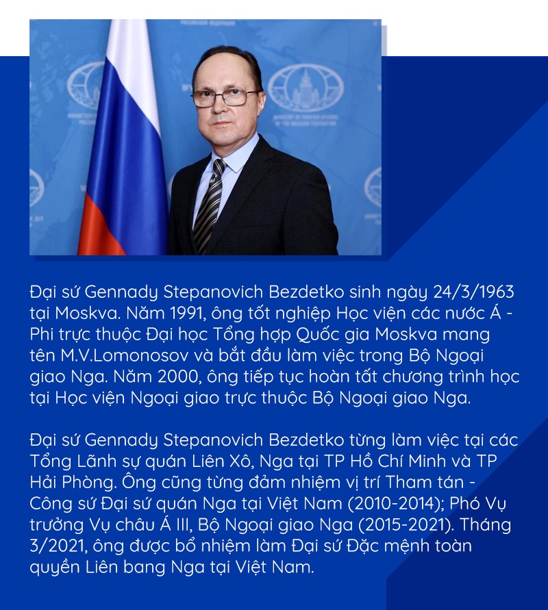 Đại sứ Gennady Stepanovich Bezdetko: Năm 2012, Nga trở thành Đối tác Chiến lược Toàn diện của Việt Nam. Hiện nay, Việt Nam đã thiết lập khuôn khổ hợp tác như vậy với 14 quốc gia, bao gồm tất cả các thành viên Hội đồng Bảo an Liên hợp quốc.