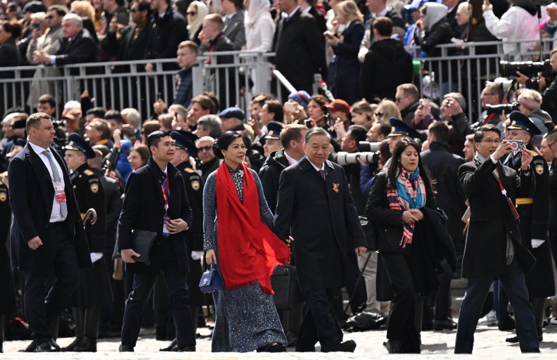 Tổng Bí thư Tô Lâm và phu nhân Ngô Phương Ly tham dự Lễ kỷ niệm 80 năm Chiến thắng trong Chiến tranh Vệ quốc vĩ đại. Ảnh: RIA Novosti.
