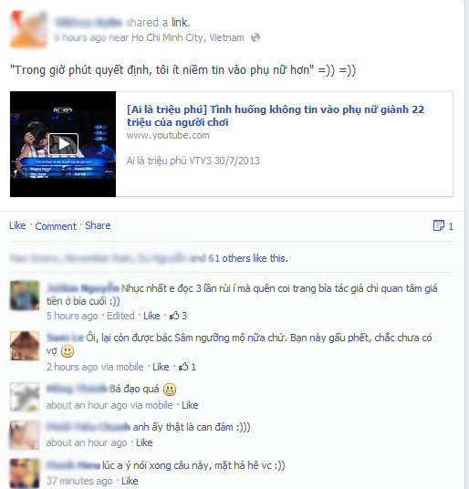 Chàng trai trẻ giành được phần thưởng trị giá 22 triệu đồng ở gameshow Ai là triệu phú tối qua (30/7) đang trở thành nhân vật gây sốt. Ở câu hỏi thứ 10, người chơi nhận được câu hỏi "Tác giả của tiểu thuyết Trở về Eden là ai" và phải dùng quyền trợ giúp hỏi ý kiến của tổ tư vấn. Hai người trợ giúp đầu đều là phụ nữ và đều chọn phương án A, thậm chí người thứ hai còn quả quyết đây là đáp án chính xác vì đã đọc tiểu thuyết này tới 3 lần. Người trợ giúp cuối cùng là nam giới và dũng cảm chọn phương án B.
