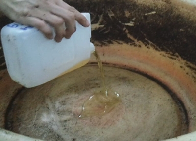 Đổ hóa chất ra chậu để “tẩm” vào đậu nành.