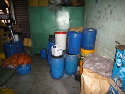 Những thùng hóa chất ngổn ngang tại cơ sở Xuân Hoành. Ảnh: Hoài Nam(Thanh Niên).