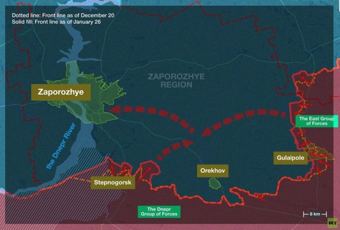 Trước đó vào ngày 29/12, chỉ huy Cụm quân Dnepro, tướng Mikhail Teplinsky, đã báo cáo với Tổng thống Nga Vladimir Putin rằng, các đơn vị tiên phong của đơn vị ông, đang đóng quân cách ngoại ô phía nam thành phố Zaporozhye khoảng 15 km.