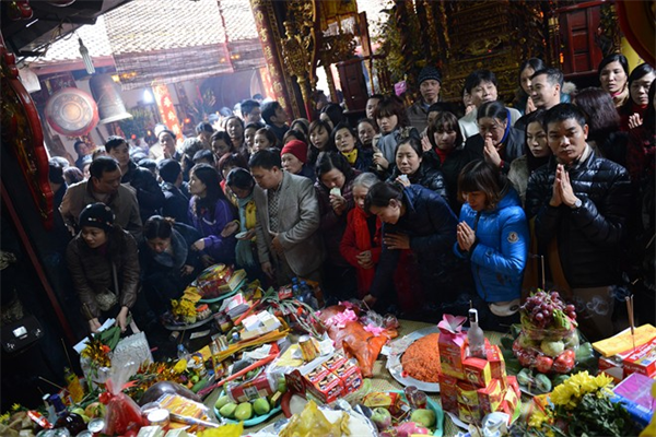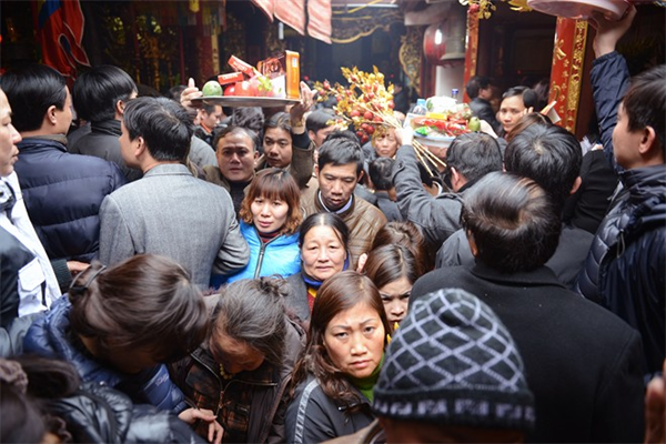 Bên trong, người dân chen lấn thắp hương, lễ bái.