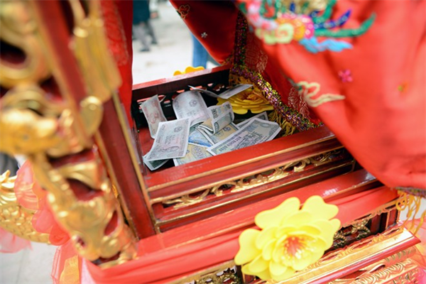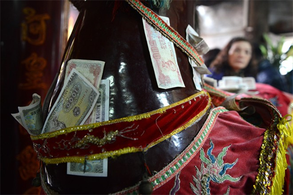 Nhiều người nhét tiền lẻ vào con ngựa gỗ trong đền.