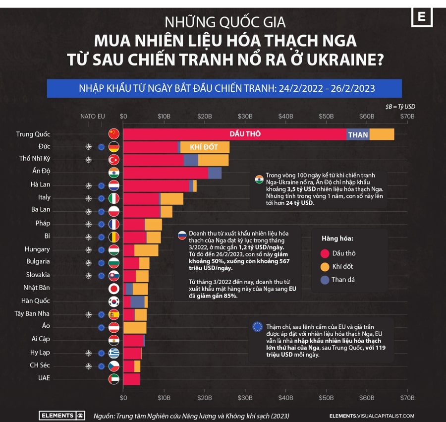 Đồ thị thông tin dưới đây sử dụng dữ liệu từ CREA thể hiện các quốc gia nhập khẩu nhiên liệu hóa thạch Nga nhiều nhất kể từ khi cuộc chiến tranh nổ ra hơn một năm trước.