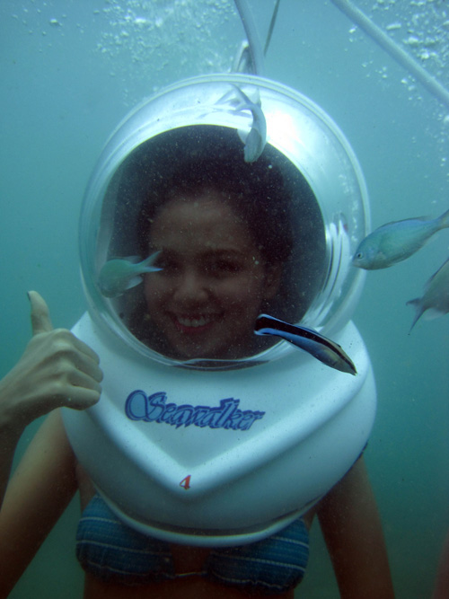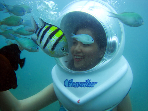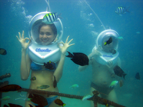 Được nhìn ngắm những rặng san hô đầy màu sắc, chạm tay vào những chú cá lạ, người đẹp vô cùng thích thú và không quên tạo dáng xì tin để ghi lại kỉ niệm này.
