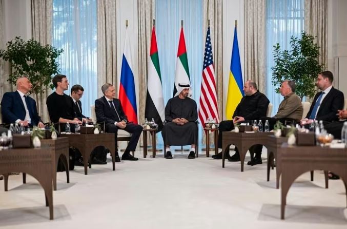 Tổng thống Các Tiêu vương quốc Arab Thống nhất (UAE) Sheikh Mohamed bin Zayed al-Nahyan (giữa) trong cuộc gặp đại diện phái đoàn Mỹ, Liên bang Nga và Ukraine tham dự cuộc đàm phán ba bên, tại thủ đô Abu Dhabi của UAE, ngày 23/1/2026. Ảnh: Reuters/TTXVN