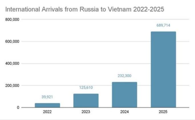 Đáng chú ý, Nga là thị trường có tốc độ tăng trưởng nhanh nhất. Trong năm 2025, Việt Nam đón 689.714 lượt khách Nga, tăng 196,9% so với năm 2024 và vượt kỷ lục 646.500 lượt của năm 2019 trước đại dịch COVID.