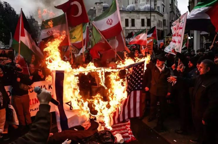 Người biểu tình ủng hộ chính quyền ở Iran đốt cờ Israel và Mỹ. Ảnh: EPA.