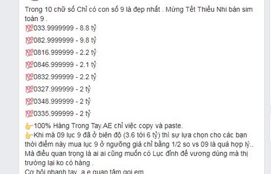 Mới đây, giới buôn sim tiếp tục xôn xao khi một chủ buôn sim số đẹp công bố mức giá mới với loại sim này. Nhiều sim có giá lên tới gần 10 tỷ. Đơn cử sim 08x.9999999 được rao bán lên tới 9,8 tỷ đồng, sim 03x.9999999 có giá 8,8 tỷ đồng, 03x.7777777 giá khoảng 3 tỷ, một số sim khác giá trên 2 tỷ đồng như 08xx.999999, 0x32.999999,...