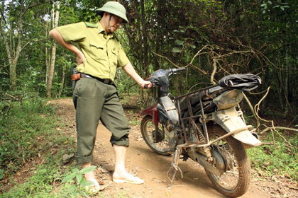 Đến đoạn này chúng tôi buộc phải cuốc bộ hơn 2 giờ đồng hồ. Ở trong KBT, chỉ lâm tặc và lực lượng kiểm lâm mới có thể “cưỡi” được xe máy. Loại xe Yamaha Sirius được coi là những con “chiến mã” duy nhất có thể “xé rừng”.