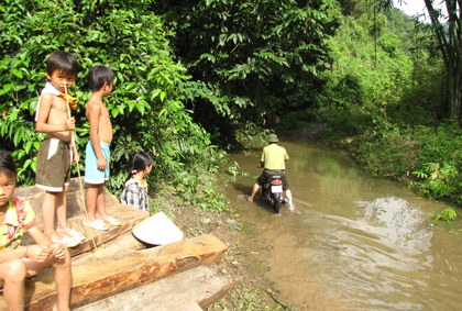 Phải mất tiếp hơn chục cây số “đánh vật” cùng con đường gập ghềnh khó đi với những con suối nước ngập ngang thân xe liên tục vắt qua đường, chúng tôi mới chính thức đến cửa rừng - điểm bắt đầu cuộc đột kích vào “đại bản doanh” của lâm tặc. Đó là khu bản Mùn, xóm Thượng Lương thuộc xã Nghinh Tường.