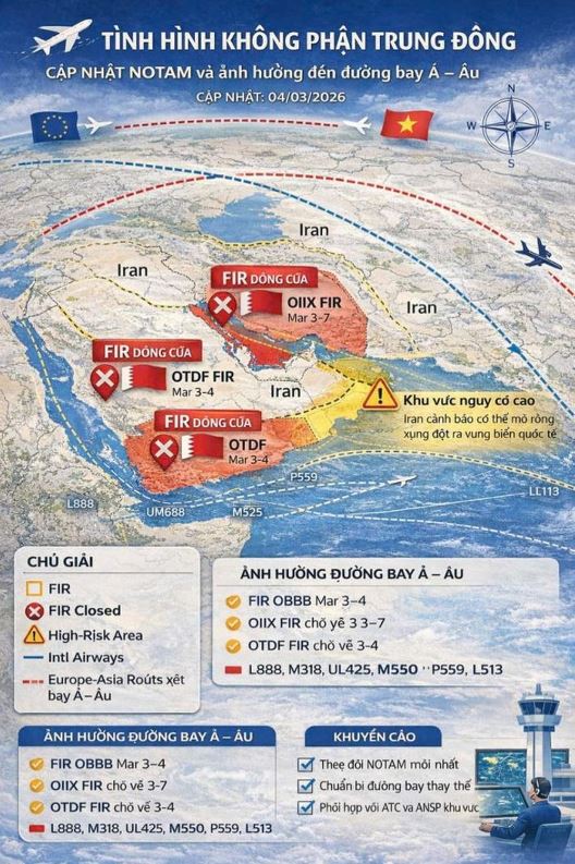 khu vực Trung Đông ngày 4-3-2026. Nguồn: Cục Hàng không Việt Nam