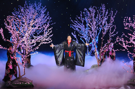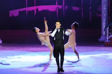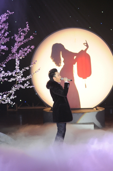 Dương Triệu Vũ song ca với Vy Oanh trong ca khúc Hỡi người tình. Sân khấu được tô điểm bằng những cánh hoa Anh đào khá lãng mạn.