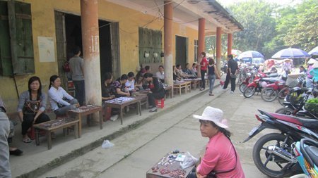 Từ sáng sớm, khi những dải sương trắng vẫn còn phảng phất dưới cái nắng xiên, hàng trăm dân buôn gom hàng từ các bãi khai thác đá quý đổ về khu chợ nhỏ gần trung tâm thị trấn Lục Yên.