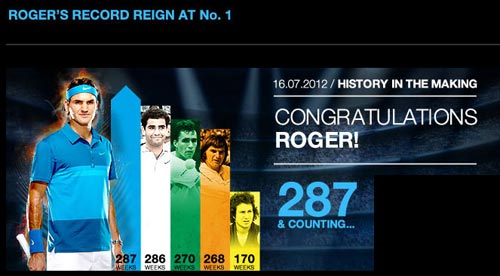 Ngay cả thành trì tưởng như sẽ là pháo đài không bao giờ đổ của Sampras là 286 tuần liên tiếp ngự trị ở ngôi số 1 TG cũng đã trở thành quá khứ khi Federer đang trải qua tuần thứ 287 ở vị trí người dẫn đầu bảng ATP trong đó có giai đoạn 237 tuần liên tục từ năm 2004 tới 2008 cũng là một kỷ lục khác.