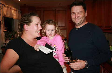 Ảnh chụp Hege Jeanette cùng chồng và con gái ba tuổi khi cô trúng xổ số cách đây ba năm. Một ngày sau đó, cô lâm bồn. Ảnh: AP