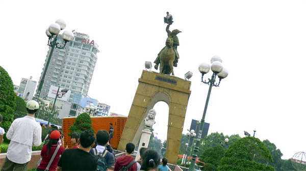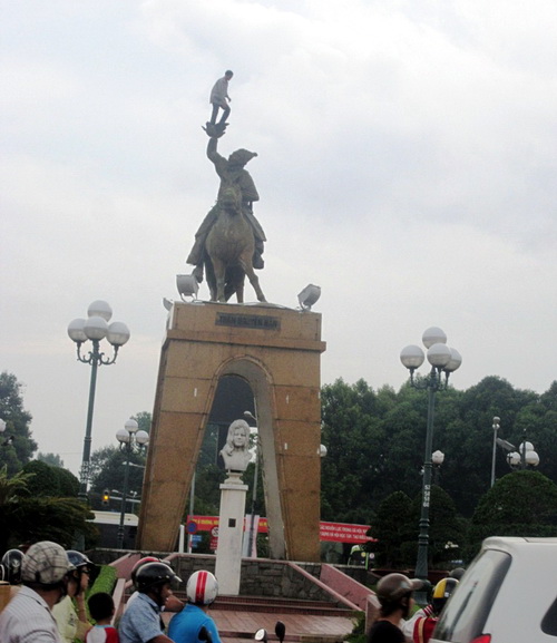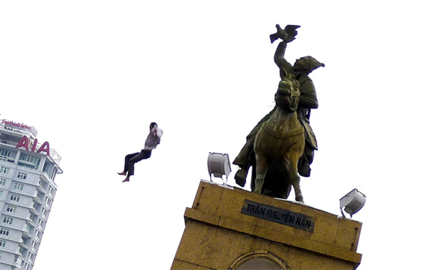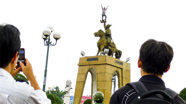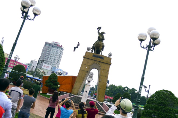 Lúc 16g30 ngày 6-10, một người đàn ông tên Phạm Văn Bình (40 tuổi, ngụ Q.4, TP.HCM) đã leo lên tượng danh tướng Trần Nguyên Hãn ở vòng xoay trước chợ Bến Thành, Q.1, TP.HCM...đứng huơ tay.