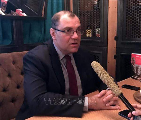 Trong ảnh: Chuyên gia về các vấn đề an ninh quốc tế, diễn giả quen thuộc trên kênh truyền hình Trung ương Nga “Rossia-1” Grigory Trofimchuk trả lời phỏng vấn phóng viên TTXVN. Ảnh: Trần Hiếu - PV TTXVN tại Nga