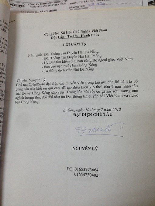 Bức thư chủ tàu QNg 96246 Nguyễn Lý gửi cảm ơn Đà Nẵng Radio và các đơn vị phối hợp - Ảnh: Nguyễn Tú