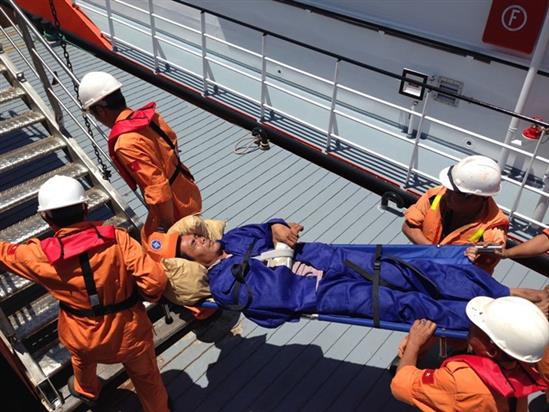 Nạn nhân bị toác mặt, vết thương thái dương trái phức tạp, trọng thương 1 mắt, lại nặng hơn 100 kg mà còn nằm ở tầng 7. Trong khi đó, thang máy nhỏ nên không thể dùng cáng cứu thương mà 6 người phải dìu nạn nhân bằng thang bộ trong khi sóng phủ cao 4-5 mét, ai cũng có thể bị gió cuốn rơi xuống biển.