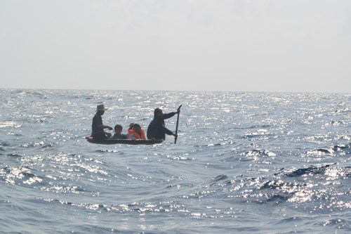 Các ngư dân tàu BĐ 95569 trước khi rời tàu đã cắm cờ Tổ quốc lên nóc để khẳng định chủ quyền Việt Nam đối với Hoàng Sa, rồi mới bơi thúng ra khỏi bãi cạn để SAR 412 đón - Ảnh: Xuân Sơn