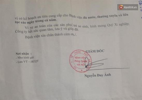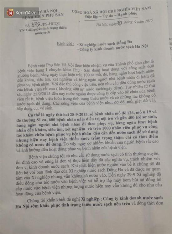 Văn bản của Giám đốc bệnh viện Phụ sản khẩn thiết đề nghị các đơn vị liên quan sớm cung cấp nước sạch.