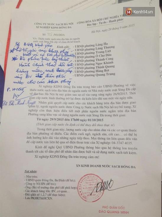 Văn bản thông báo mất nước của Xí nghiệp Kinh doanh nước sạch Đống Đa.