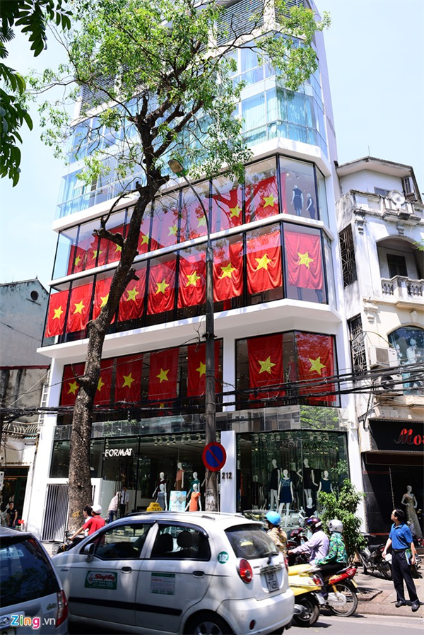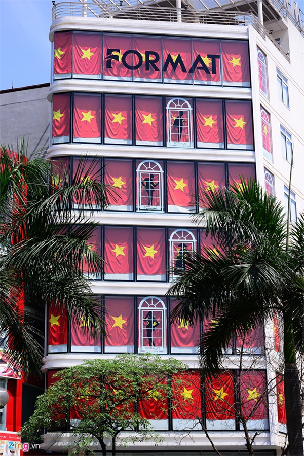 Một tòa nhà 8 tầng ở số 100 Trần Duy Hưng treo 48 lá cờ dọc 6 tầng xuyên suốt từ tầng 2 lên tầng 7, mỗi tầng treo 8 lá cờ.