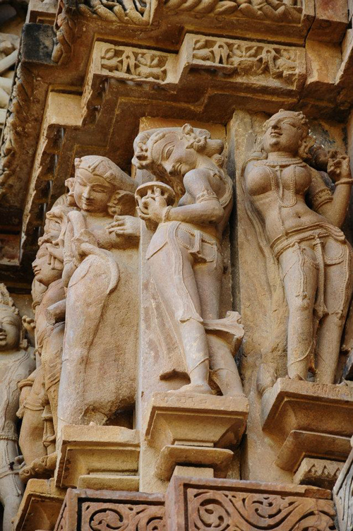 Những hình chạm trổ trên đá về vũ nữ apsara hay hình những thiếu nữ đồng trinh tuyệt đẹp xuất hiện trên đỉnh cột của các đền đài. Xen kẽ giữa các nữ thần là những nhóm tượng cặp trai gái, hoặc từng nhóm trai gái, đang giao hoan với những tư thế từng được mô tả trong cuốn sách tình dục nổi tiếng Kamasutra.