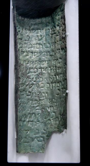 Một phần của cuộn giấy bằng đồng từ hang động Qumran. CC BY-SA 4.0 / Osama Shukir Muhammed Amin FRCP / Strip of the Copper Scroll from Qumran Cave 3 written in the Hebrew Mishnaic dialect, on display at the Jordan Museum, Amman (cropped image)