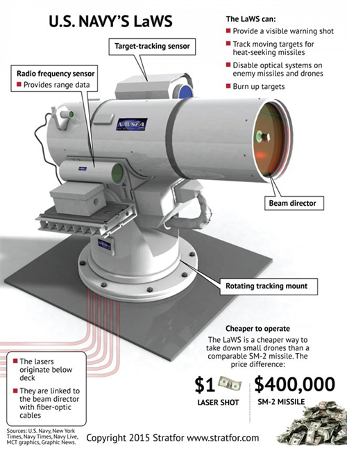 LaWS, có công suất 100 kilowatt, xuất hiện trên tàu USS Ponce vào mùa hè năm ngoái trong khuôn khổ một dự án nghiên cứu và phát triển trị giá 40 triệu USD nhằm đánh giá tiềm năng của một hệ thống vũ khí không sử dụng các loại đạn đắt tiền.