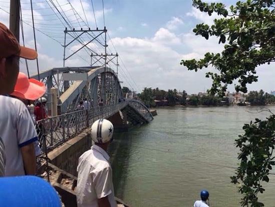 Chiếc sà lan va vào móng cầu khiến 2 nhịp cầu bị gãy. Ít nhất 3 người đang chạy xe máy trên cầu rớt xuống sông, tuy nhiên tất cả đã được cứu kịp thời. Ảnh do bạn đọc Leo cung cấp